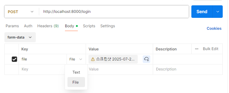form-data의 매개변수는 File을 선택해주고 데이터를 전송해보자.