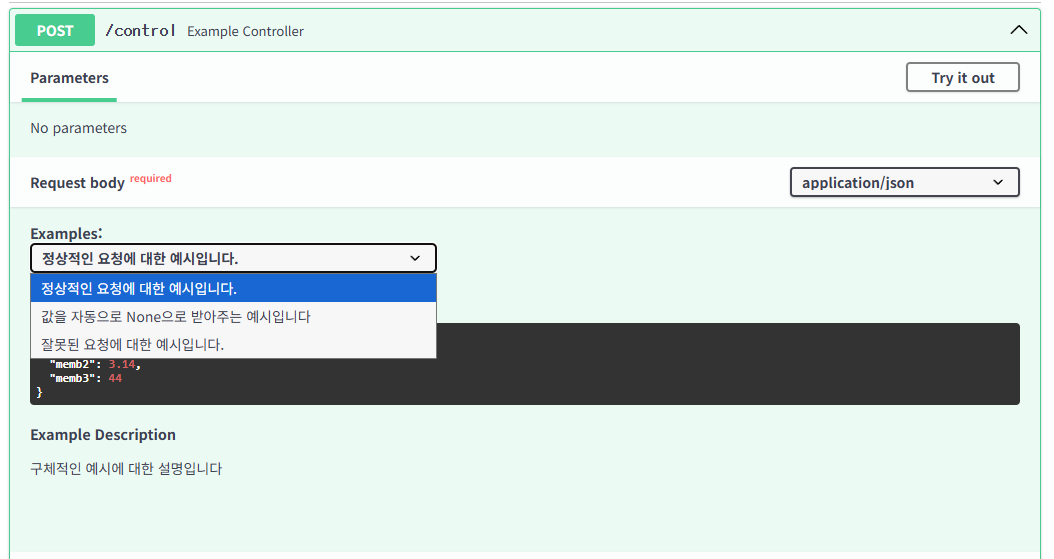 이렇게 FastAPI의 Swagger UI에서 파라미터에 대한 예시를 확인할 수 있게 된다.