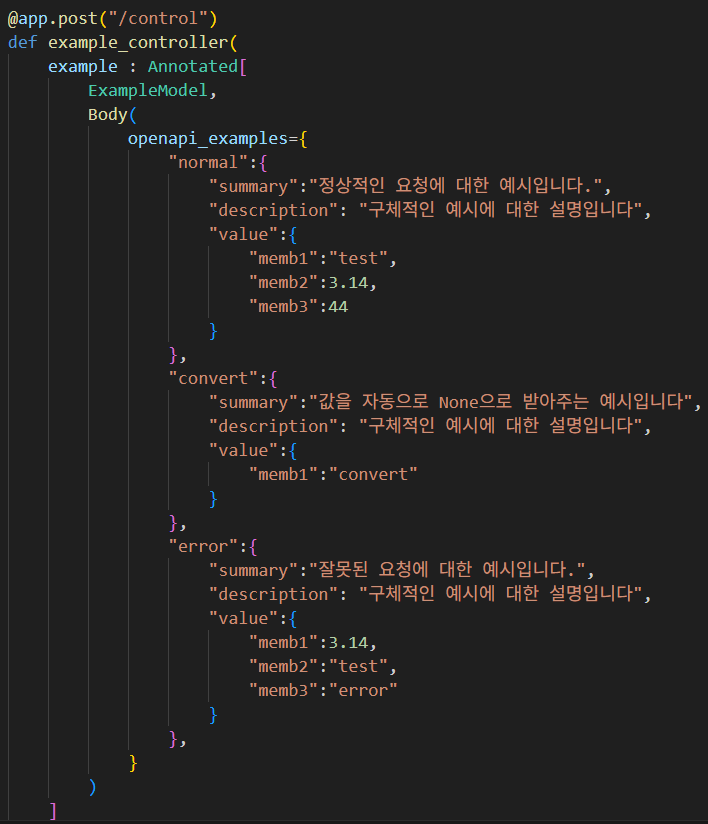 이렇게 구성되면 openapi_examples내부의 첫번째 depth의 normal, convert, error은 각자의 값을 구분하는 key에 대한 내용으로 사실은 크게 의미 있는 값은 아니고 관리자가 이를 관리할때 해당 값들은 뭘 위한 것에 대해서 한번에 알 수 있게 설정하는 간단한 명칭이라고 보면 된다.