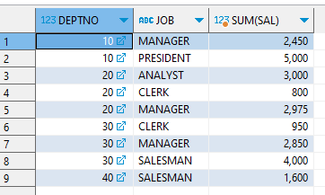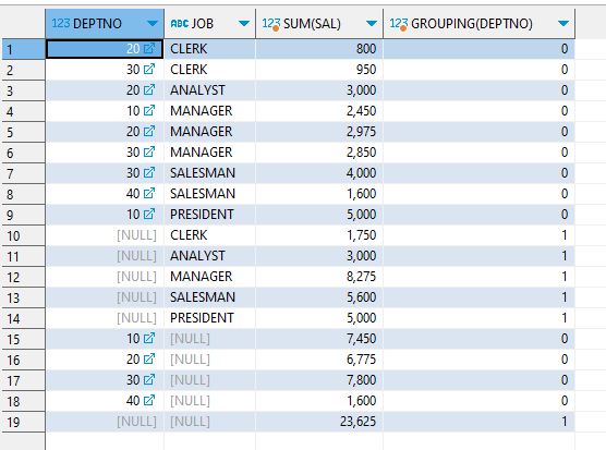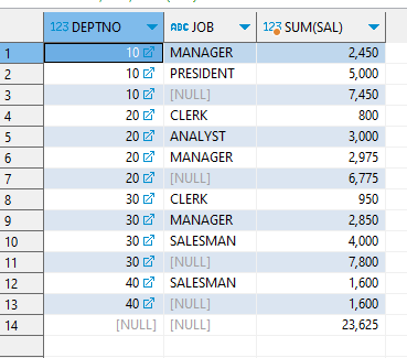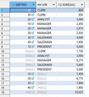 GROUP BY GROUPING SETS((DEPTNO,JOB),DEPTNO,JOB,());