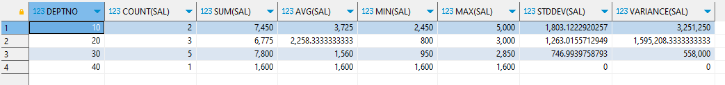 GROUP BY절은 DEPTNO(부서번호)를 기준으로 데이터를 그룹화하고, 함수들은 그룹화된 데이터를 기반으로(부서별로) 결과를 만들어 값을 반환하기에 그룹핑한 컬럼과 그에 맞는 함수 값이 나올수 있기에 동시에 그룹핑한 컬럼을 보여주는것 또한 가능하다.