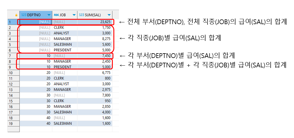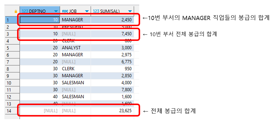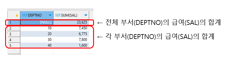 부서별 봉급의 합계와 전체 봉급의 합계가 같이 출력되는 것을 볼 수 있다.