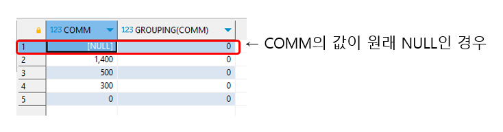 이 COMM을 GROUP BY로 묶는다면  NULL인 그룹도 묶이게 되어 있는데 이것은 소계된 결과가 아니기 때문에 1이 아닌 0으로 나오게 되어 있다.