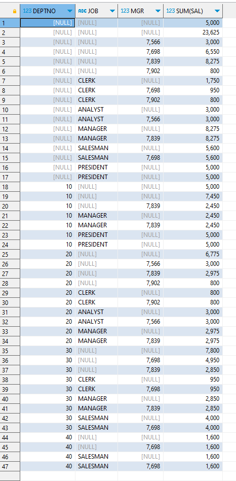 GROUP BY CUBE(DEPTNO, JOB, MGR);