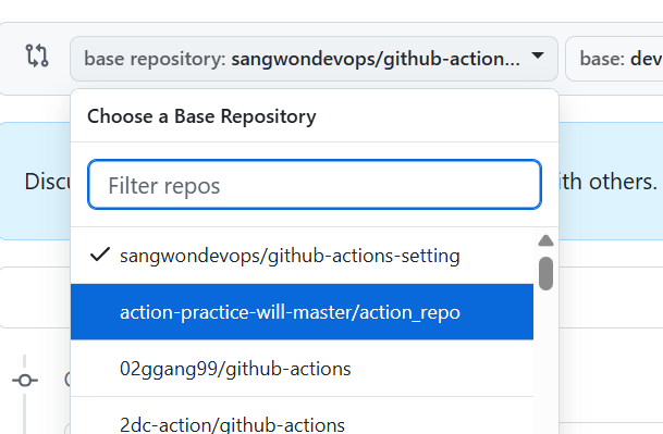 아마 포크하는 경우는 베이직하게 포크한 레포지토리로 풀리퀘스트하는 것으로 설정 되어 있는가보다.