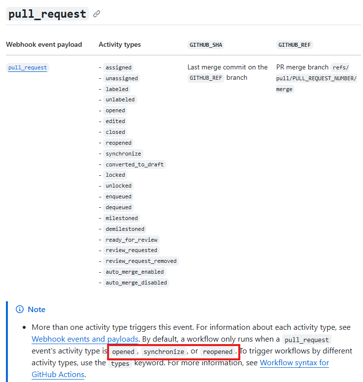 pull_request의 Activity types중 opened와 synchronize와 reopen을 default로 설정한것과 같은 동작을 하게 된다.