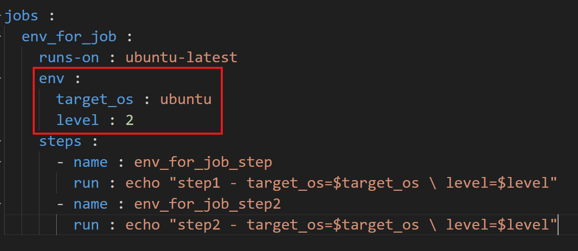 Job 레벨 환경변수는 명칭이 workflow 레벨 환경변수와 겹칠 경우 더 우선 순위를 가진다.