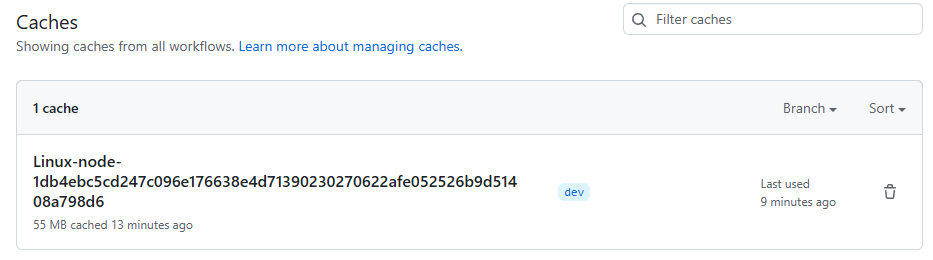 그리고 이 캐시는 Actions의 좌측 메뉴에서 Caches를 보면