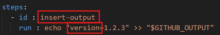 job을 만들어주는데 첫번째 step에서 echo를 통해서 버전 정보를 임의로 전달하고 이걸 $GITHUB_OUTPUT에 저장하도록 해주자.
