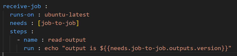 그리고 그렇게 외부로 노출된 output은 다음 Job에서 이전 Job에 대한 needs로 의존을 만든 후에 needs.[job-id].outputs.[key]로 output을 가져올 수 있다.