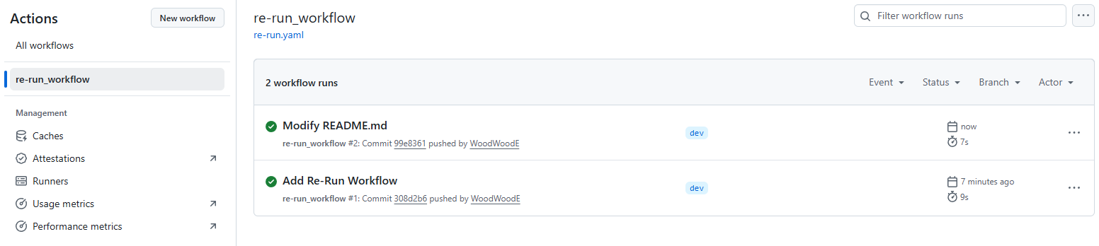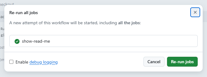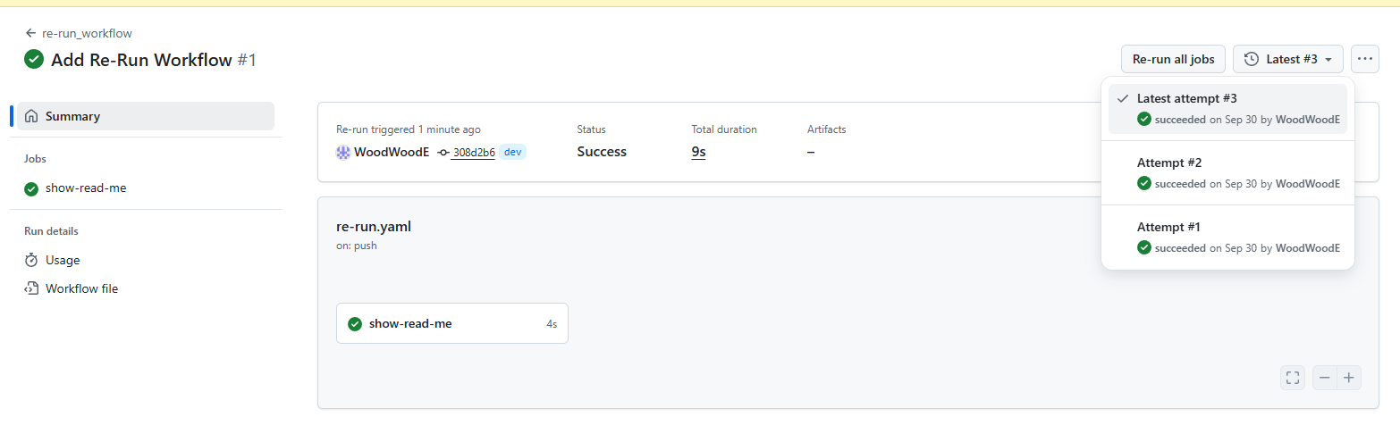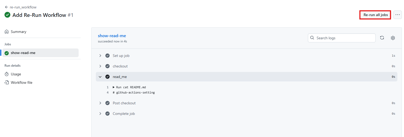 그리고 보면 commit을 해서 레포지터리의 README.md의 파일 내용은 달라졌으나 이전에 했던 workflow의 실행을 다시 re-run 한다면