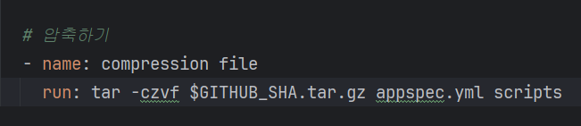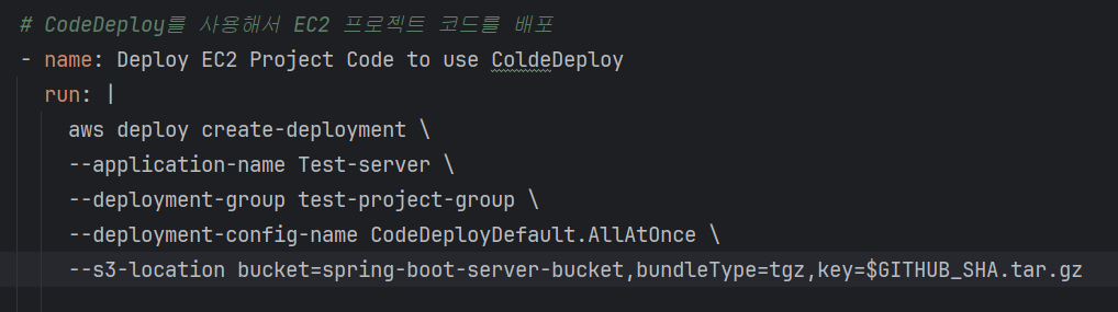 이건 region인 ap-northeast-2에 있는 s3에 로컬의 ./$GITHUB_SHA.tar.gz을 s3의 spring-boot-server-bucket이라는 버켓의 /$GITHUB_SHAR.tar.gz로 복사하겠다라는 의미로 사용된다.