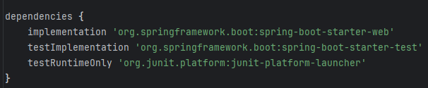 | testRuntimeOnly | 테스트 실행 시만 | 테스트 실행 시에만 필요한 라이브러리(JUnit런처 같은 라이브러리) |