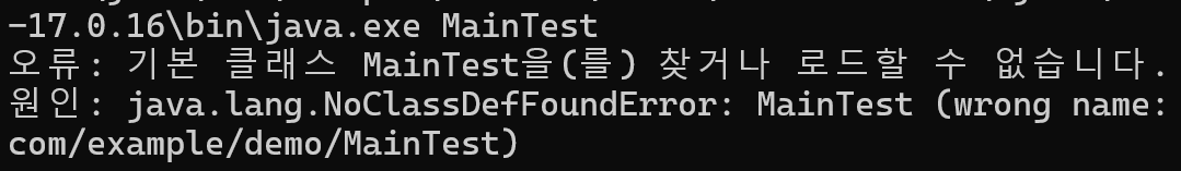 MainTest는 com.example.demo 패키지로 선언되어 있기에 Java는 이걸 기준으로 실행할 MainTest라는 파일을 찾는데 java MainTest는 디폴트 패키지로 간주되어 충돌이 발생하는 것이다.