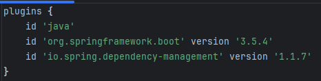 사용하는 언어(이걸 기준으로 어떻게 컴파일할지, 어떻게 실행할지를 Gradle이 바라봄, 단순하게 javac를 사용해서 컴파일 할지, 다른 언어의 경우는 다른 프로그램을 사용해서 컴파일 할지에 대해서 결정함)를 사용할것이고 Spring Boot 프레임워크를 사용할것이고 의존성 관리는 dependency-management 플러그인을 통해 처리하겠다는 의미가 된다.