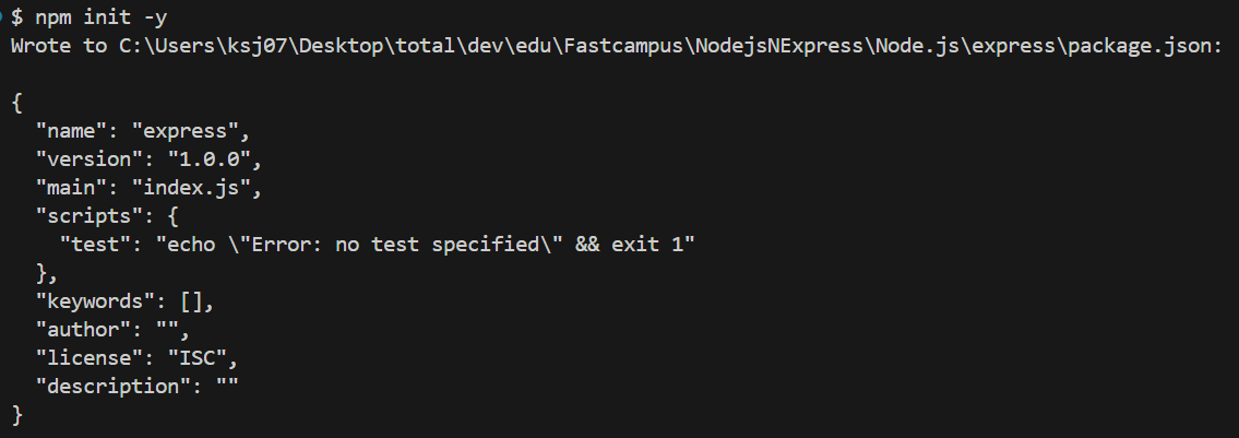 Express.js를 사용하기 위해서 먼저 프로젝트를 하나 생성해서 package.json을 npm init을 사용해서 생성해주고