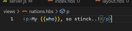 이를 확인하기 위해 추가적으로 nations.hbs라는 파일을 하나 더 생성해주고 이 안에는 p태그 하나만 사용해서 내용을 추가로 작성해주자.