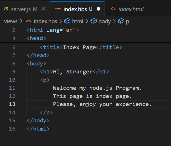 MVC 구조에서 V에 해당하는 views폴더에 index.hbs라는 파일을 하나 생성해주자.
