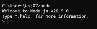 이렇게 Node.js를 설치해줬으면 자바스크립트를 실행할 수 있는 노드 환경으로 진입을 할 수 있는데 이 노드환경으로 들어가기 위한 명령어는 node만 입력해주면 된다.