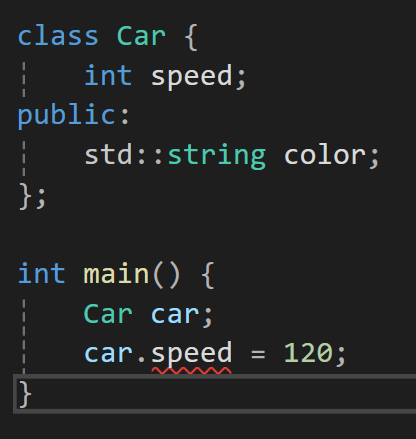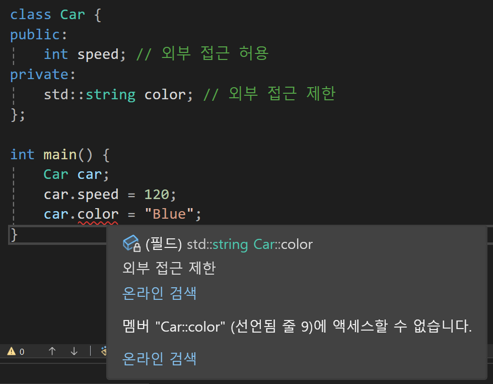 // myCar.speed = 100; // ❌ 직접 접근 불가 (컴파일 에러)