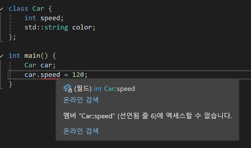 // myCar.speed = 100; // ❌ 직접 접근 불가 (컴파일 에러)