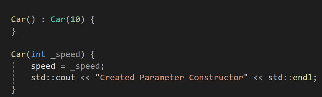 그렇기에 디폴트 생성자에서 매개변수 있는 생성자에 10을 전달하면서 호출하면 그 기능에 대한 코드를 작성할 필요가 없을텐데 이걸 코드로써 보여주자면