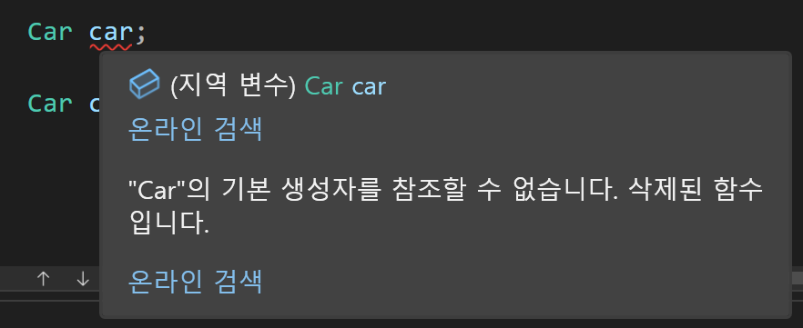 추가로 만약 내가 원하는 방식이 디폴트 생성자가 만들어지지 않기를 바란다면 default 대신에 delete를 넣어주면
