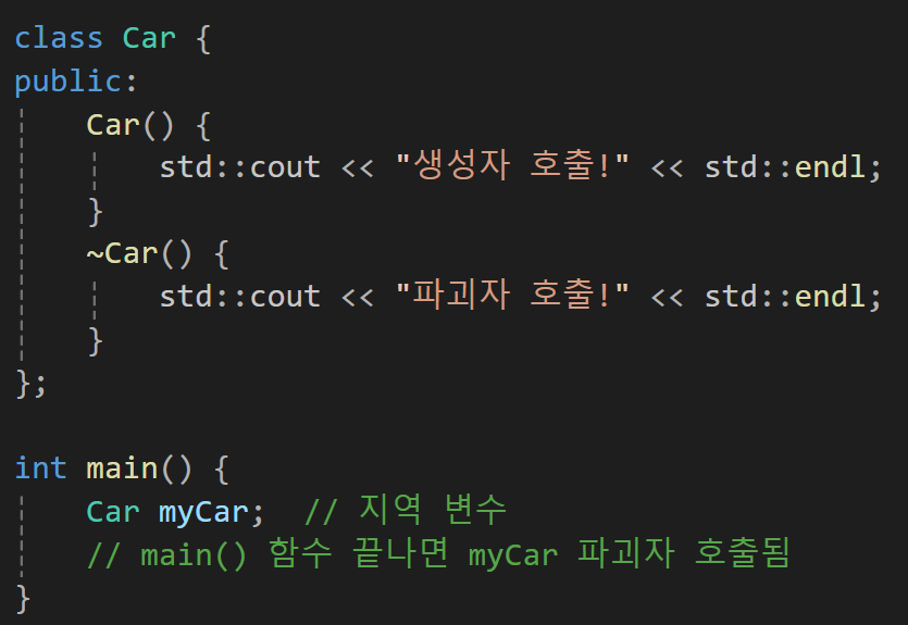 파괴자는 지역 변수로 생성된 객체가 스코프를 벗어날 때 delete로 객체를 지울때 프로그램 종료 시점에 자동으로 호출된다.