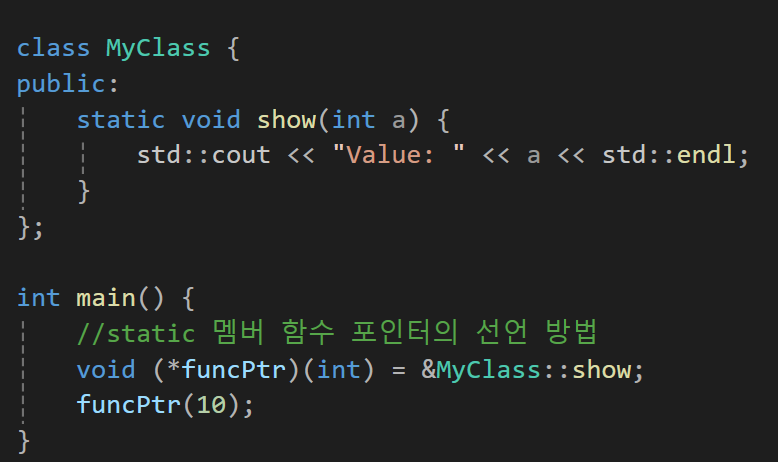 1. funcPtr은 MyClass 클래스의 멤버 함수 show(int) 를 가리킴(void (MyClass::*funcPtr)(int) = &MyClass::show;)