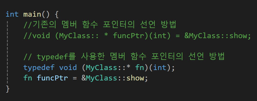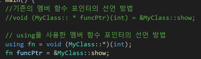 멤버 함수 포인터의 타입을 보면 매우 복잡하게 구현됨을 알 수 있는데 이를 간단하게 사용할 수 있는 방법은 우리가 이전에 사용했던 typedef, using, std::function이 있다.