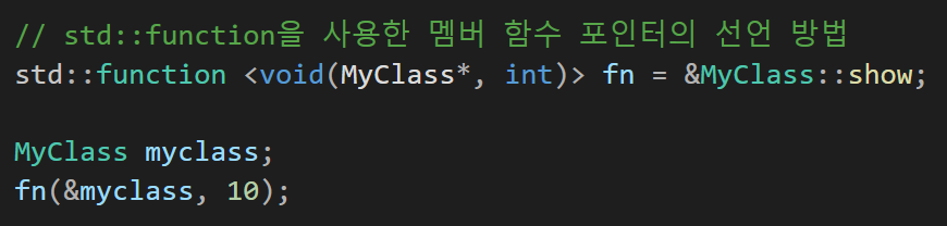 std::function <반환명(클래스명* ,매개변수 타입)> 변수명 = &클래스명::함수명;