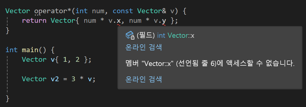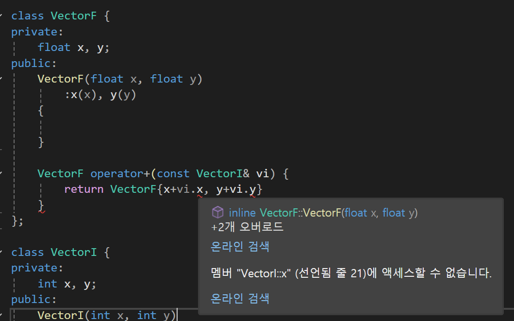 근데 이렇게 수행하면 VectorI의 멤버변수가 private이기에 접근이 불가능하다고 나오게 될 것이다.