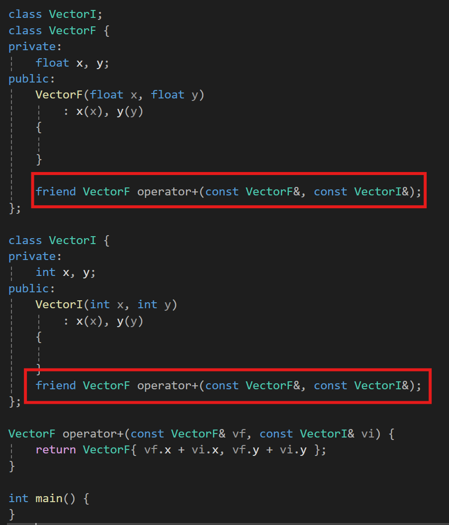 근데 사실 이렇게 하나의 파일에서 이렇게 사용하는것은 사실 불가능한게 VectorF에서 VectorI를 사용하려면 VectorI에 대한 프로토 타입이 제공되어야 하고 그래서 전방선언으로