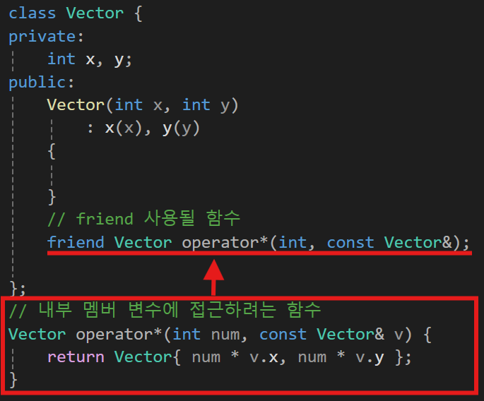 이 friend을 넣는 곳은 멤버 변수를 가져올 쪽에서 넣어줘야 아 이 클래스에서 접근하는 경우는 다 열어줘~ 라고 알려주는 것이다.