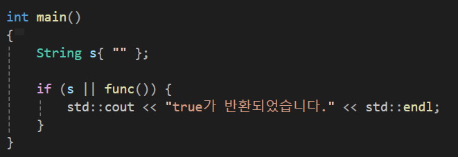 이 비교를 할때 s가 true가 나온다면 func()가 실행되지 않는 단락연산을 수행해서 func 함수의 출력문이 출력되면 안될텐데