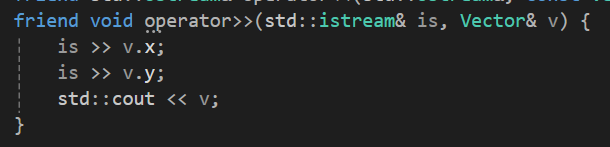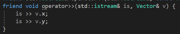 istream타입이니 반환형은 void에 매개변수 첫 번째로는 istream객체를 참조로 받아주고 두번째 매개변수로는 Vector의 값을 변경해야 함으로 그냥 Vector객체를 참조값으로 받아주자.