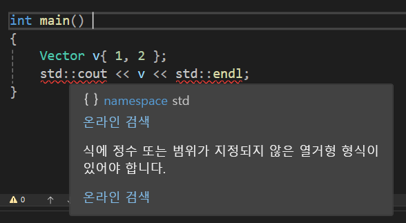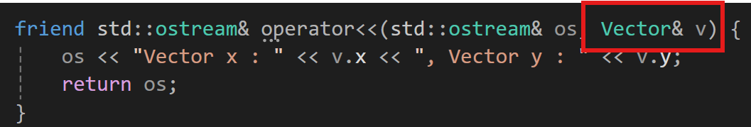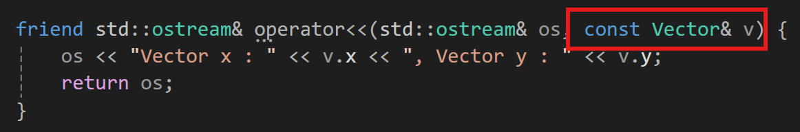 여기서 주의해야할 점은 나는 매개변수의 타입을 const Vector& 로 넣긴 했다만 매개변수의 타입을 Vector&로만 할 경우 문제가 발생할 수 있는데 아래를 보면 우리가 만들었던 <<출력 연산자에서 문제가 생겼다.