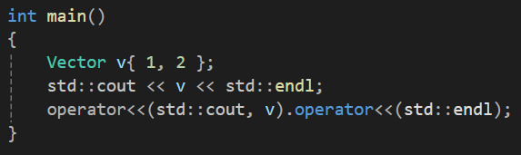 그러면 사실 cout이 좌항으로 cout.operator(v)가 되어야하는데 사실 cout은 표준 입출력이기 때문에 우리가 구현을 다시할 수 가 없기에 기존에 전역 함수로 만들었던 operator(cout, v)와 같은 구현을 해보도록 하자.