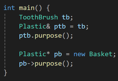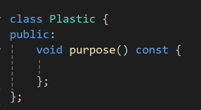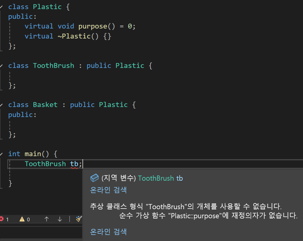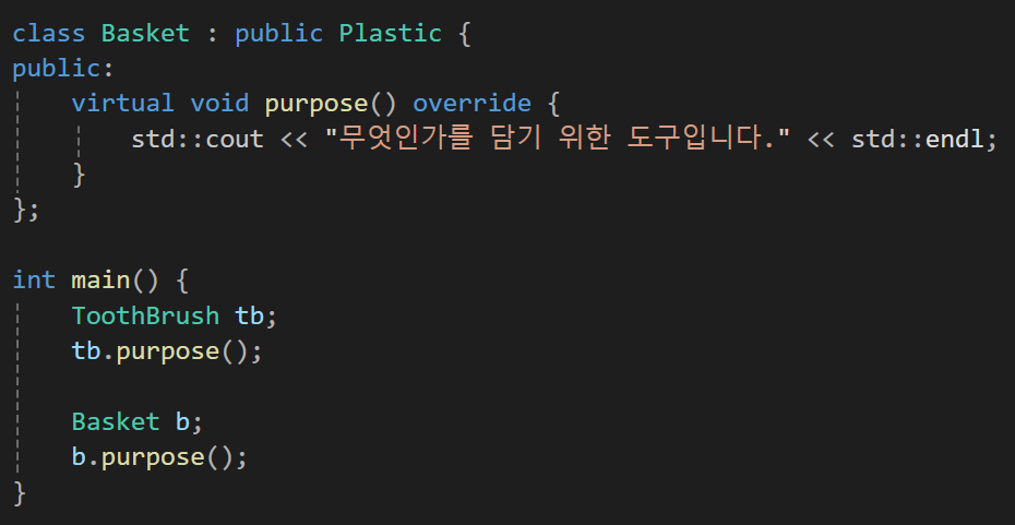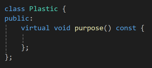 이때 각각의 도구들은 이제 기능 함수라는 기능을 오버라이딩 하게 될것이기에 플라스틱의 purpose 함수를 가상함수로 만들어주자.