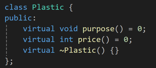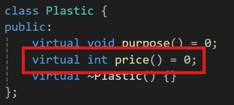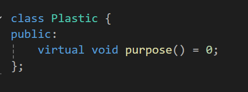 여기서 생각해보면 플라스틱 자체에는 기능을 갖고 있지 않으며 이 기능이 만들어지는 도구마다 천차만별의 기능을 하게 될 것이기에 이걸 플라스틱 자체에서 선언하지 말고 순수 가상함수로 만들어줄것이다.