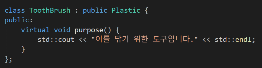 이때 각각의 도구들은 이제 기능 함수라는 기능을 오버라이딩 하게 될것이기에 플라스틱의 purpose 함수를 가상함수로 만들어주자.