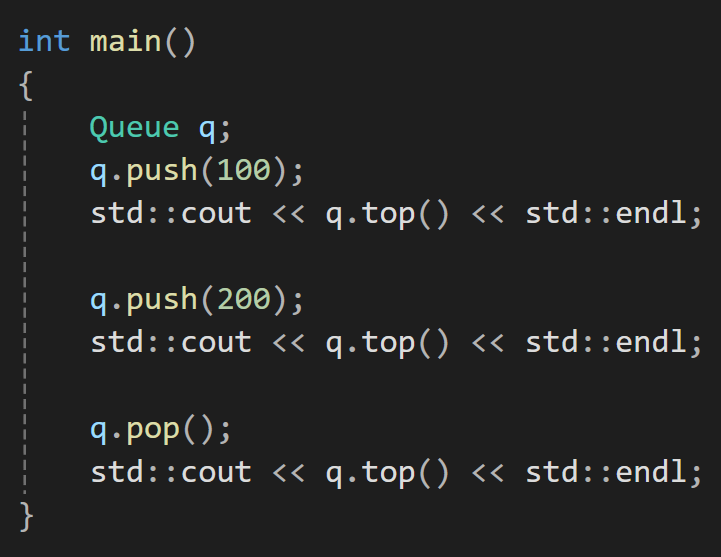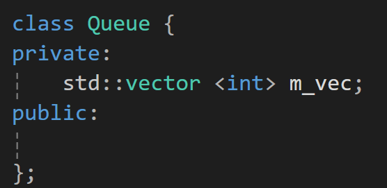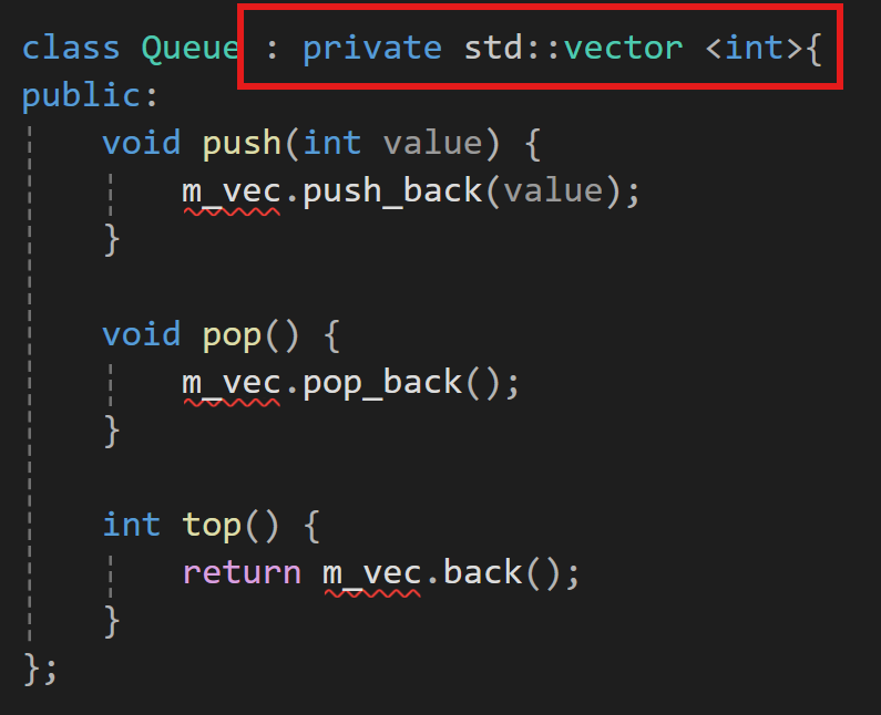 이 경우에 Queue와 vector멤버 변수 m_vec과 push, pop, top의 경우는 has-a 관계이다.