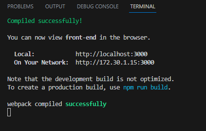우선 react의 설치는 이게 끝이고 마지막으로 react 서버를 실행해줘야 하는데 먼저 터미널에서 react가 설치된 front-end폴더로 이동한 후에 아래와 같이 명령어를 실행하면 react가 실행된다.