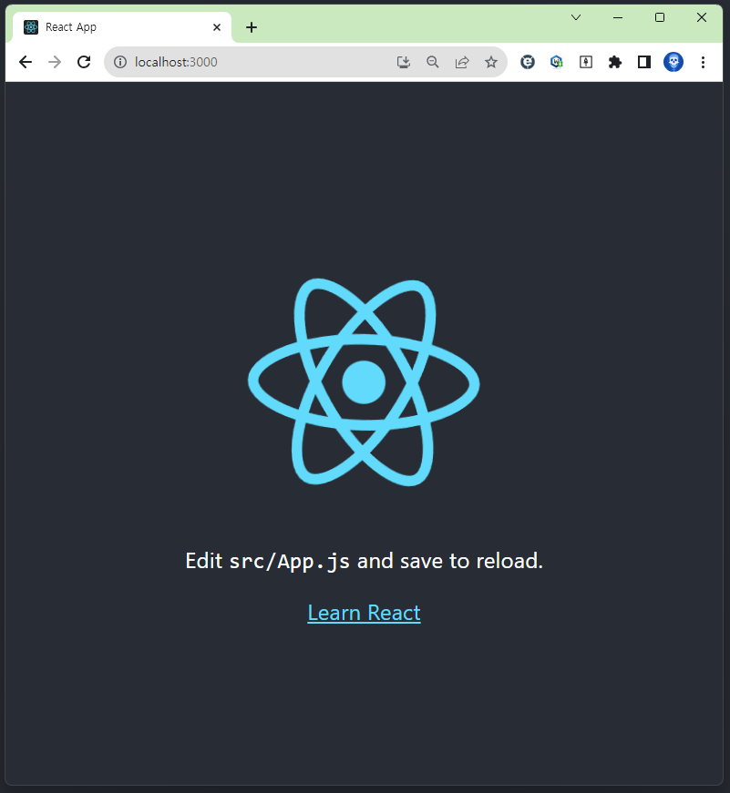 잘 실행되면 아래와 같은 로그가 남고 React App이라는 페이지가 열린다.