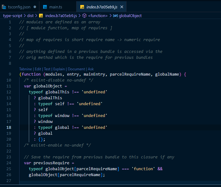 그리고 잘 보면 main.js가 아니라 main.ts로 되어 있는건 parcel 번들러에서 출력해주는 내용이기 때문이라서 그렇다고 한다(크게 중요하진 않은가봄)