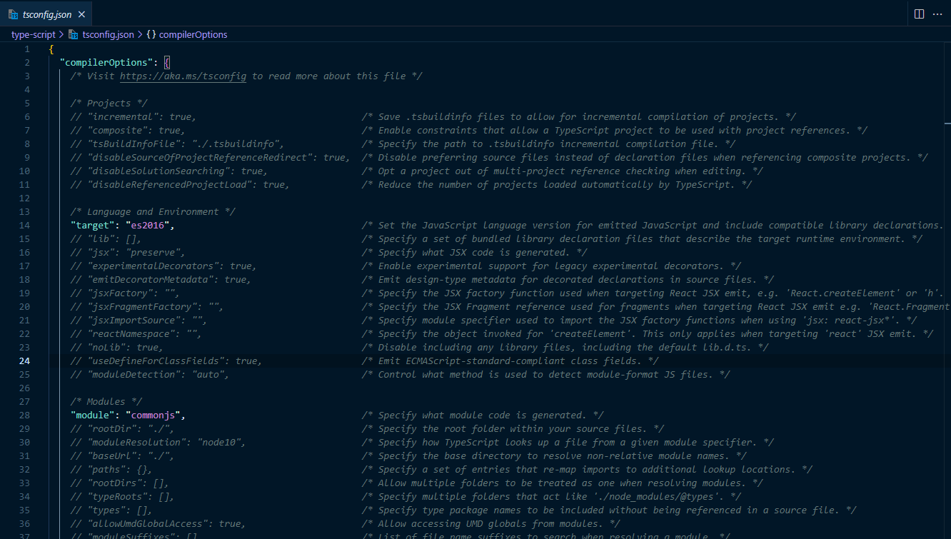 ** npx tsc --init을 해서 생성되는 tsconfig.json에는 대략적으로 들어올 수 있는 설정들에 대한 내용이 작성되어 있으니 참고하자.