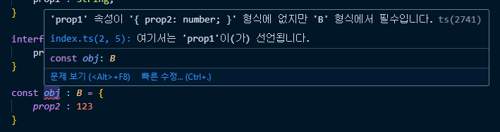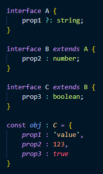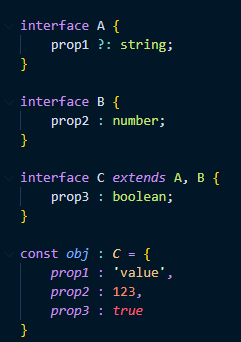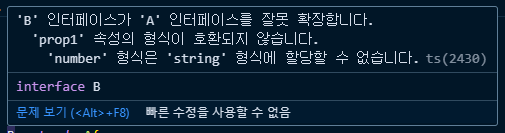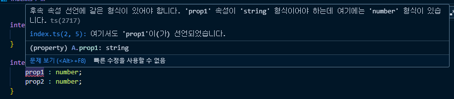 유의해야할 점은 상속하는 인터페이스에 상속을 받는 인터페이스와 동일한 명칭의 속성이 다른 타입으로 존재한다면 에러가 발생한다.
