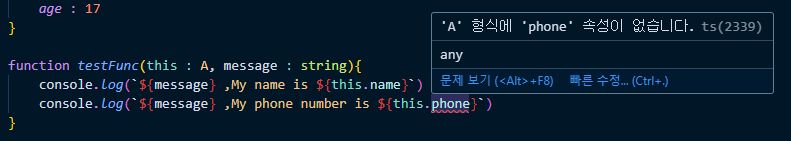 컴파일러는 어떤 객체가 전달되었건 this는 A타입이라고 생각하기 때문에 이렇게 A 타입에선 이런 속성이 존재하지 않는다고 컴파일 에러를 발생시킨다.