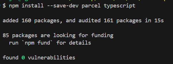 그리고 parcel이란 패키지와 typescript패키지 두개를 설치해줄 것인데, parcel은 웹 애플리케이션 번들러로, 타입스크립트 파일을 자동으로 처리할 수 있게 도와주는 패키지이다.