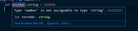 이렇게 string 타입의 변수에 number를 대입할 수 없다고 나오는데 이게 타입스크립트에서는 자바스크립트와 다르게 타입을 지정해주는 방법이다.